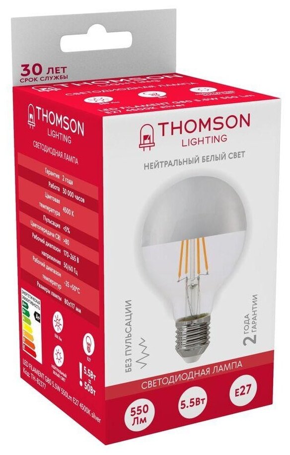 Лучшие цены. Лампочка светодиодная филаментная TH-B2377 из серии G80 имеет прозрачную колбу формы шар, цоколь E27 и мощность 5,5W. Световой поток составляет 550 lm. Лампочка обладает цветовой температурой 4500К. Питание от напряжения 220V. Площадь освещения составит до 2 кв. Магазины в вашем городе.