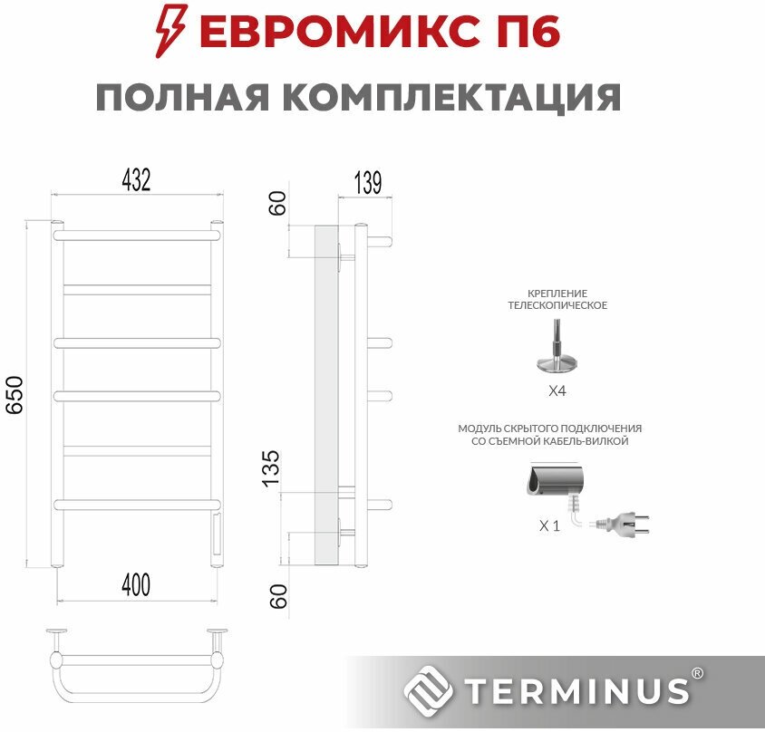 Электрический полотенцесушитель TERMINUS Евромикс П8, с креплением, хром