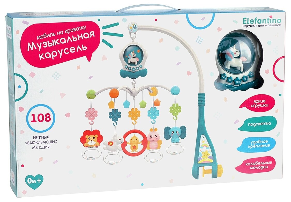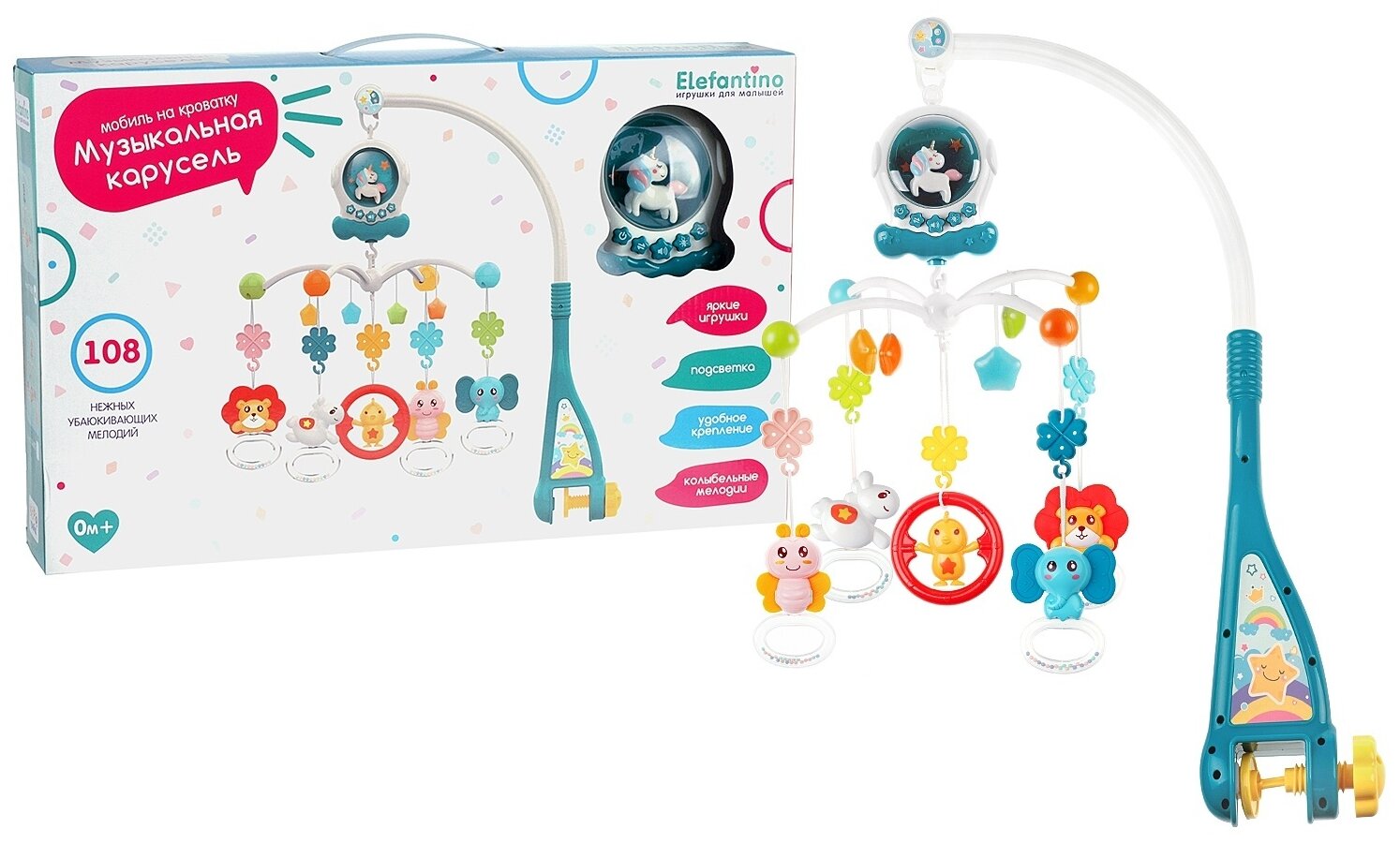 Музыкальная карусель на кроватку “Elefantino“ на бат. 108 мелодий, 5 вращ. игрушек