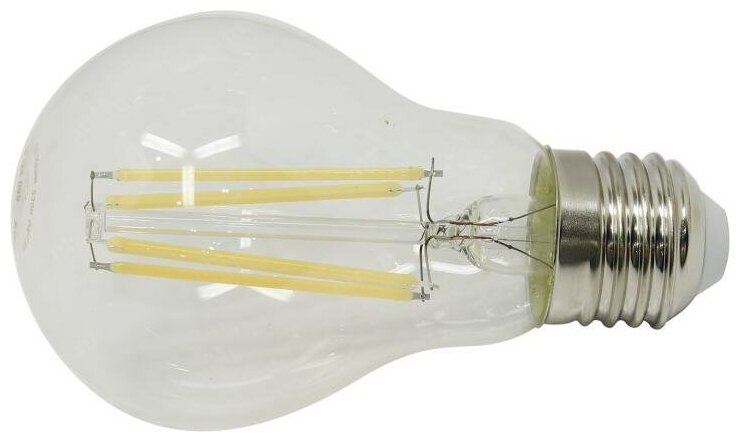 Лучшие цены. Характеристики Тип: филаментная Цоколь: E27 Цветопередача, Ra: 80 Диаметр, мм: 60 Требует пуско-регулирующей аппаратуры: нет Длина, мм: 105 Вид: CL/прозрачная Тип колбы: A60 Цветовая температура, К: 4000 Световой поток, Лм: 830 Срок службы, ч: 10000 Мощность (Вт): 8 Напряжение, В: 220 Угол светового пучка, град: 360 Эквивалент лампы накаливания, Вт: 80 Цветность: естественный белый (3300 - 5000 К). Магазины в вашем городе.