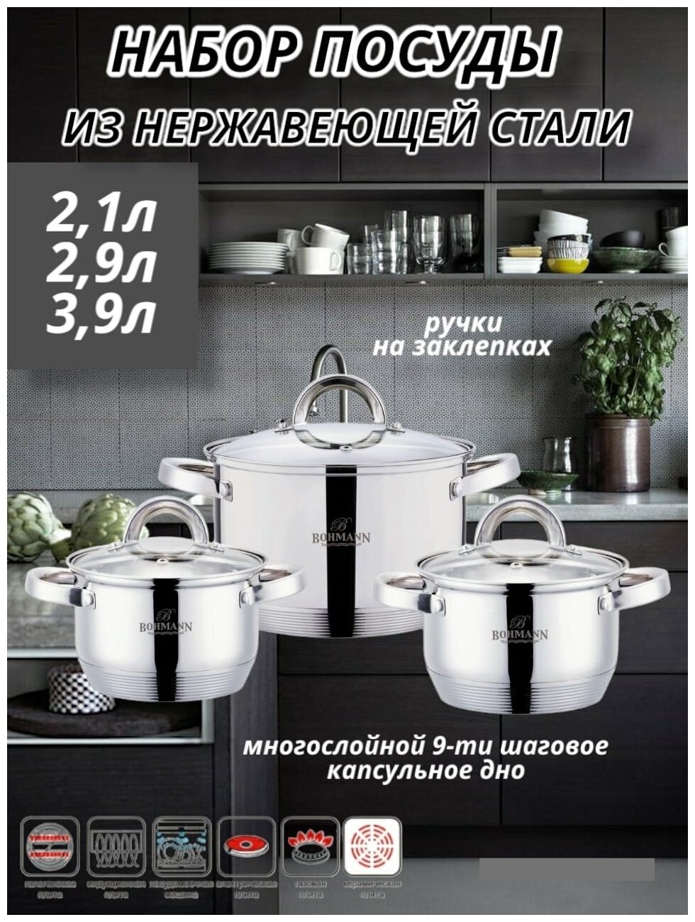 Кастрюли Посуда BH - 06-295 / 6пр / 2,1л; 2,9л; 3,9л / Дно 9-ти шаговое (х4)