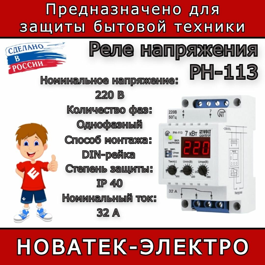 Реле однофазное напряжения 32А РН-113 7кВт Новатек-Электро 230В 32А