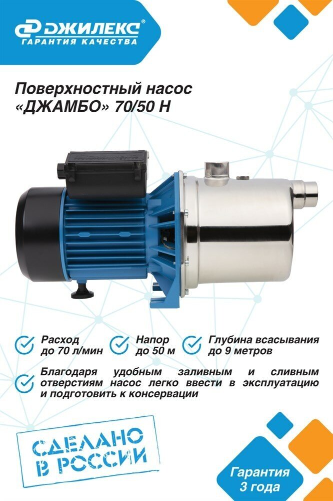 Лучшие цены. Поверхностный насос Джилекс Джамбо 70/50 Н имеет производительность 4,2 м3 и напор 50 метров, а его корпус выполнен из нержавеющей стали. Насос, способный выполнять задачи по поливу, выкачиванию воды в ручном режиме. Предназначен для подачи чистой воды из колодцев, скважин, открытых водоемов, резервуаров или повышения давления в магистральных трубопроводах в ручном режиме (для автоматизации необходимо купить дополнительные комплектующие). Магазины в вашем городе.