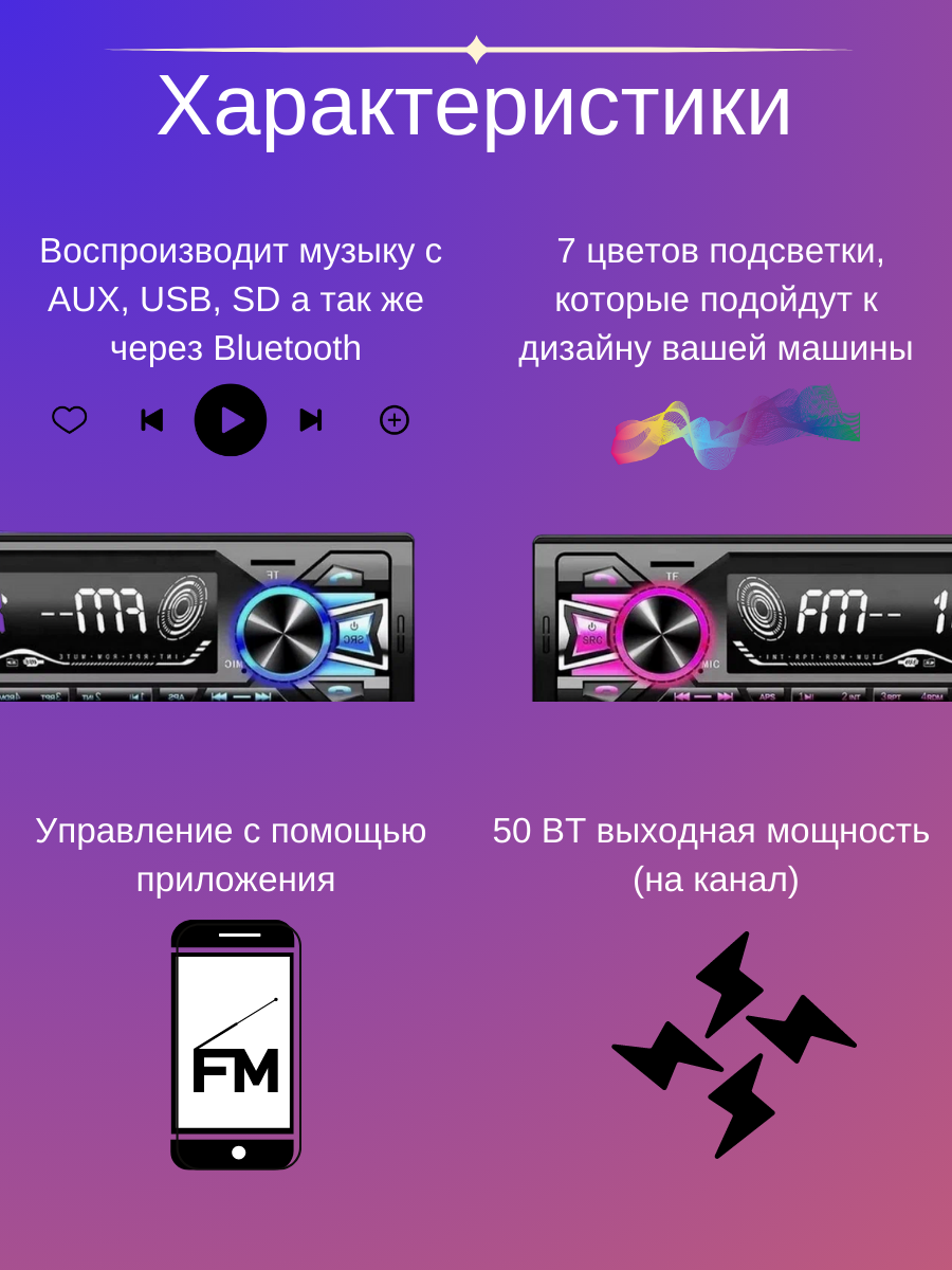 Лучшие цены. Удобная 1 DIN магнитола с большим функционалам за плечами. Имеет возможность воспроизводить музыку с AUX, USB, SD а так же через Bluetooth. Для этого имеется приложение, которое вы сможете установить на iPhone или Android. Имеет функцию громкой связи, которая вам даст доступ разговаривать по телефону через магнитолу. Есть возможность выбора подсветки, в запасе есть 7 цветов, которые подойдут к дизайну вашей машины. Магазины в вашем городе.