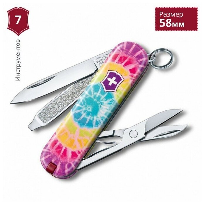 Нож-брелок VICTORINOX Classic 0.6223.L2103 "Tie Dye", 58 мм, 7 функций, лезвие и инструменты из нержавеющей стали, рукоять из пластика Cellidor