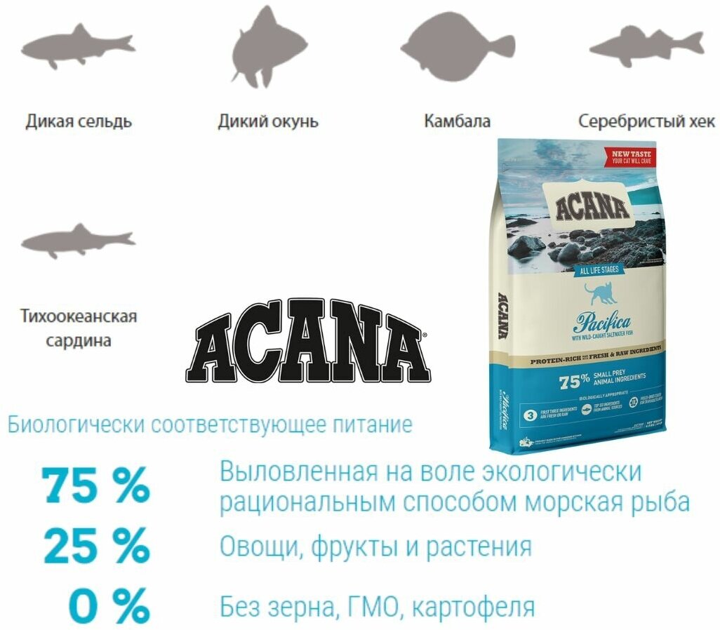 Лучшие цены. Кошкам требуется диета, богатая животным белком. Эта потребность определяется их физиологическим строением и хищническим характером. ACANA Pacifica предлагает вашей кошке свежую морскую рыбу. Она богата белком и питательными веществами, полученными из мышечного мяса, внутренних органов, хрящей и костей, присутствующих в пропорциях WholePrey в нашей пище. Это гарантирует, что ваша кошка получит все, что ей нужно, чтобы быть полностью здоровой. почему вашей кошке нужен корм акана. Магазины в вашем городе.