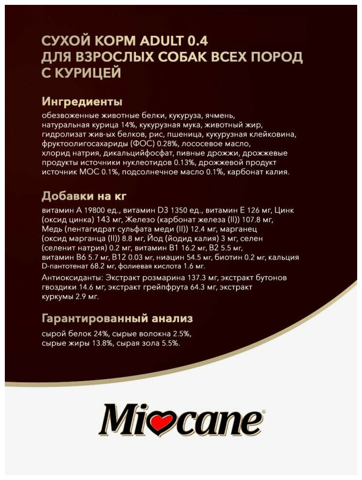 Корм для собак Корм сухой Miocane ADULT 0.4 для взрослых собак средних пород с большим содержанием куриного мяса, 3кг
