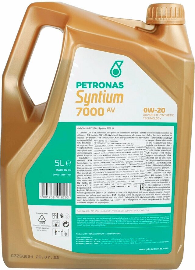 70410M12EU Моторное масло PETRONAS SYNTIUM 7000 AV синт. 0W20 5л API SN+, ACEA C5.VW 508.00/509.00