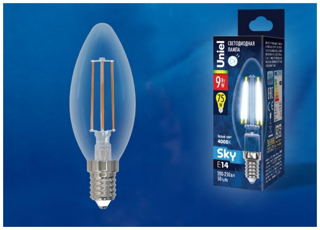 Светодиодная лампа Uniel LED-C35-9W/4000K/E14/CL PLS02WH Форма "свеча", прозрачная. Серия Sky. Белый свет (4000К). Картон. ТМ .
