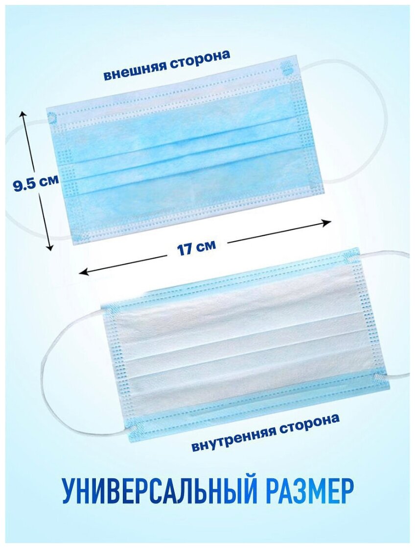 Маска медицинская Маска медицинская одноразовая (50 штук) 3-х слойная на резинке, из нетканого материала, голубая