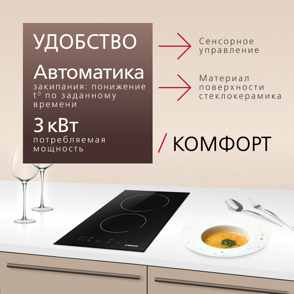 Электрическая варочная панель Hansa BHC36106, двухконфорочная, автоматика закипания, блокировка от детей, таймер, автоотключение, индикация остаточного тепла 14 990 ₽ Подробнее