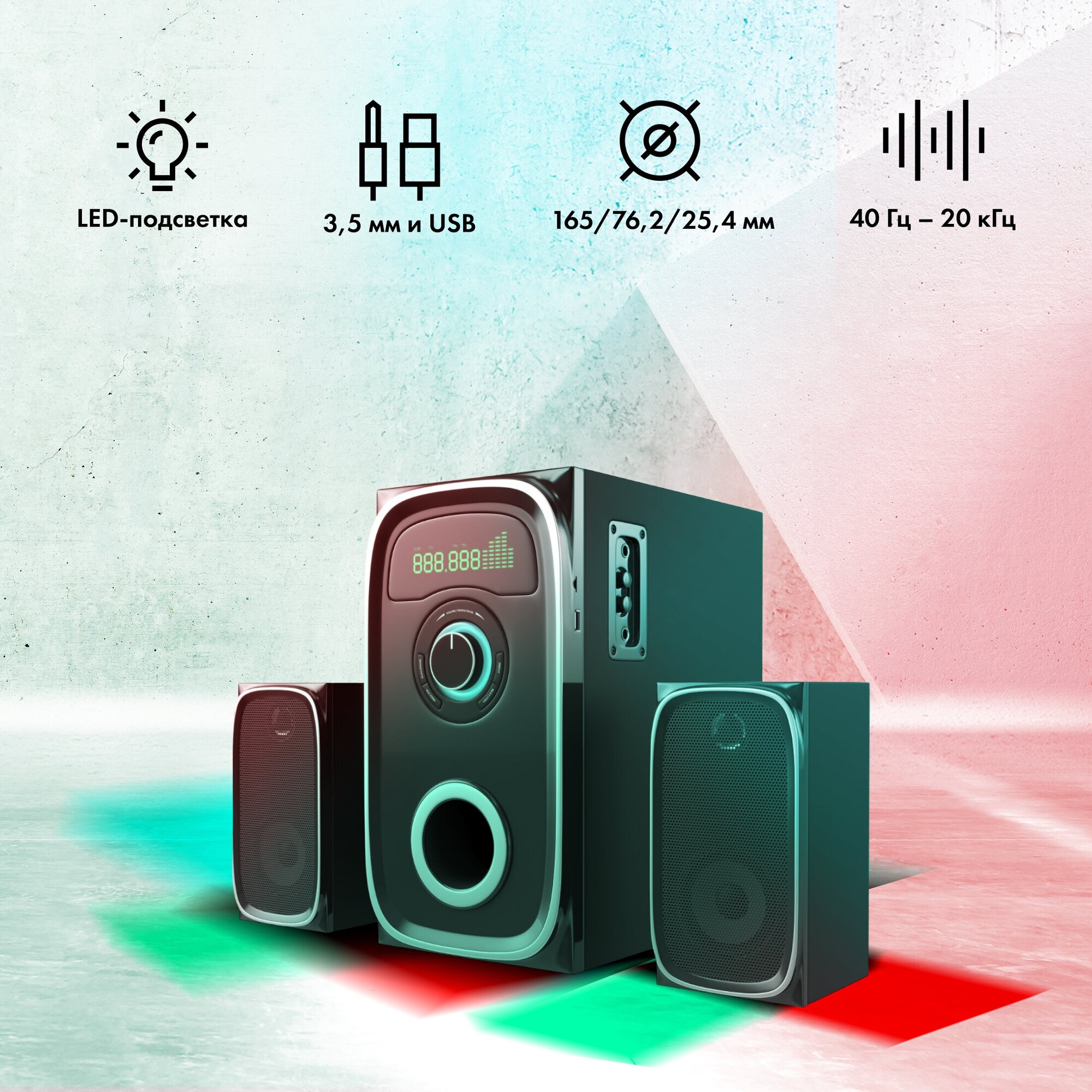 Лучшие цены. Цвет черный Акустический тип 2.1 Тип акустики стационарная Цвет акустики черный Суммарная звуковая мощность 90 Отношение сигнал/шум 65 Размеры сабвуфера 200x334x380мм Бренд OKLICK Тип беспроводного подключения Bluetooth Тип электропитания от сети Частотный диапазон 40Гц-20КГц Количество фронтальных колонок 2 Фронтальные колонки (мощность одного динамика) 20 Количество полос фронтальных колонок широкополосные Размер широкополосного динамика (фронт) 76.2 мм Размеры ВЧ динамика (фронт). Магазины в вашем городе.