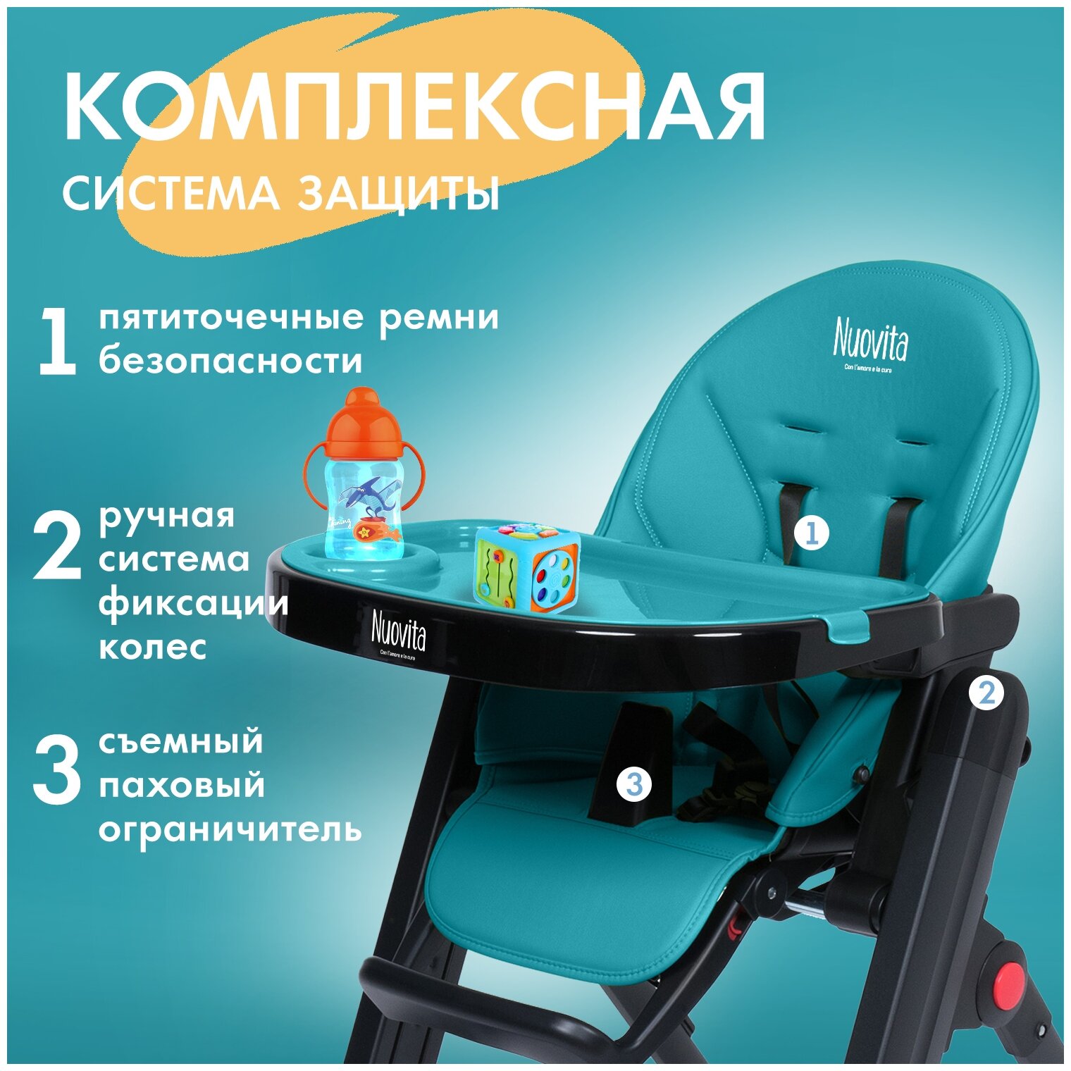 Лучшие цены. Ручная система фиксации колес. Чехол из ЭКО-кожи. 5 уровней наклона спинки. 7 уровней высоты кресла. 3 уровня регулировки подножки. Широкая гамма ярких и стильных расцветок. Стульчик для кормления Nuovita Futuro Senso оборудован комфортным сиденьем, столиком-подносом, ремнями безопасности и 2 прорезиненными колесами со стопорами. Ремни имеют удобную кнопку-фиксатор, которую можно расстегнуть одним движением и быстро извлечь малыша из кресла. Магазины в вашем городе.