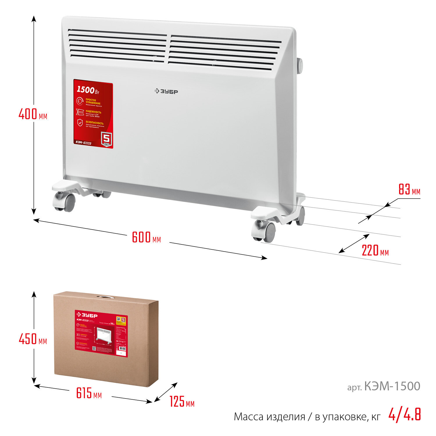 ЗУБР 1.5 кВт 595х400х83 мм, электрический конвектор КЭМ-1500 Мастер