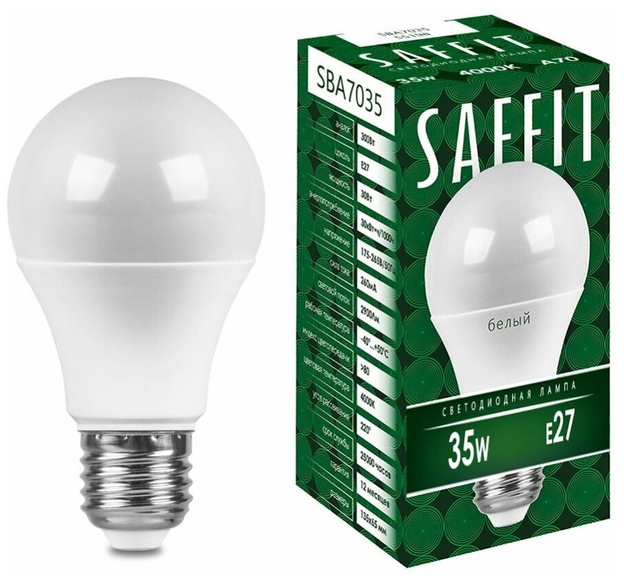 Лучшие цены. Лампа светодиодная SAFFIT SBA7035, A70 (шар), 35W 230V E27 4000К (белый), рассеиватель матовый белый, 3150Lm, угол рассеивания 220°, 137*70мм. Магазины в вашем городе.