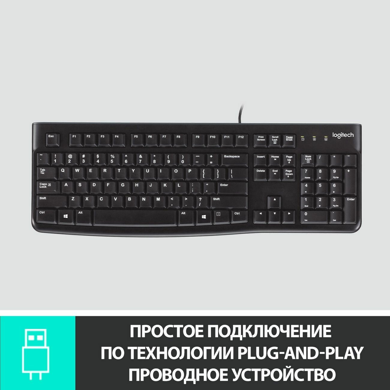 Клавиатура Logitech K120 черная, офисная, 104 клавиши, защита от воды USB 1.5м, RTL