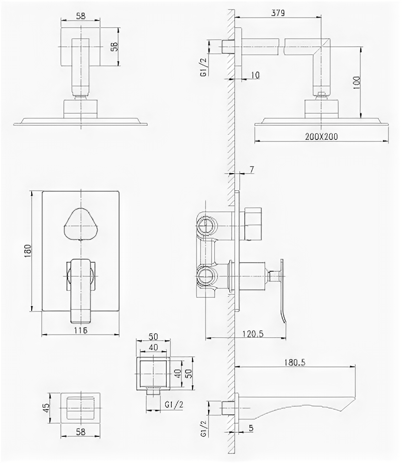 | Комплектация | лейка / верхний душ / смеситель / излив / душевой шланг / крепление лейки |