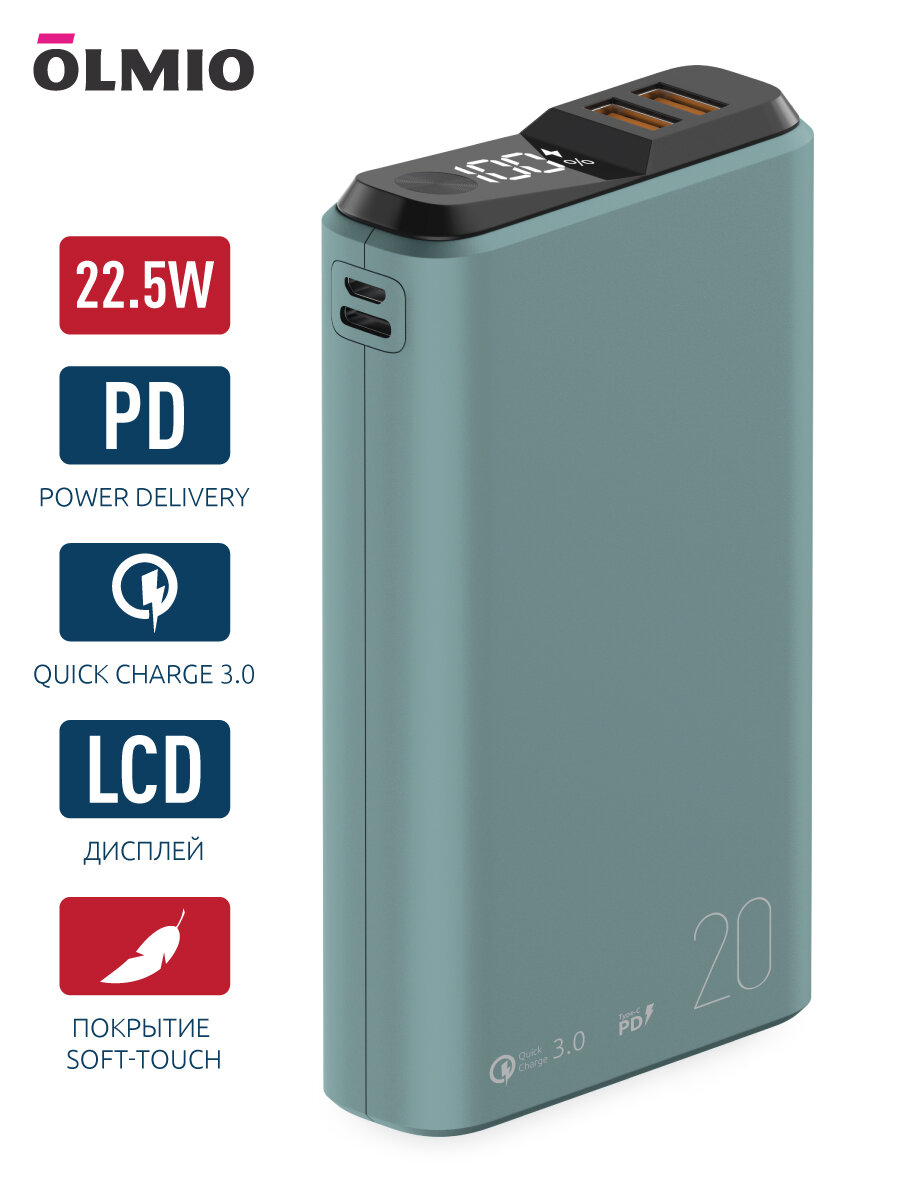Внешний аккумулятор OLMIO QS-20, 20000mAh, 18W QuickCharge3.0/PowerDelivery, LCD, Зеленый