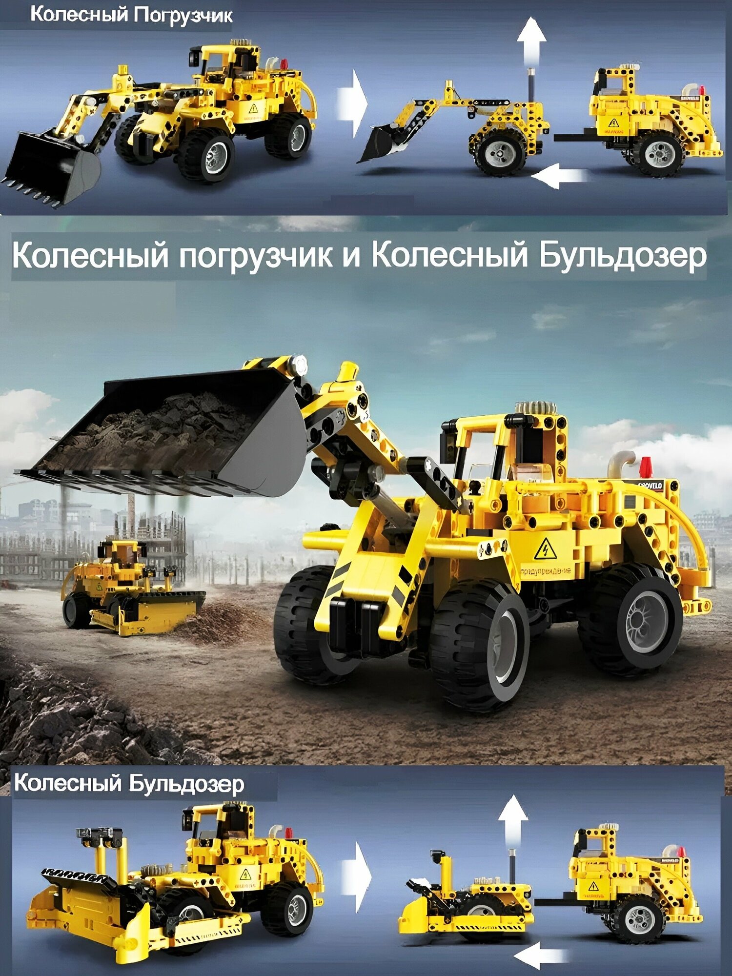 Конструктор 2в1 'Бульдозер+погрузчик' 693 детали в коробке