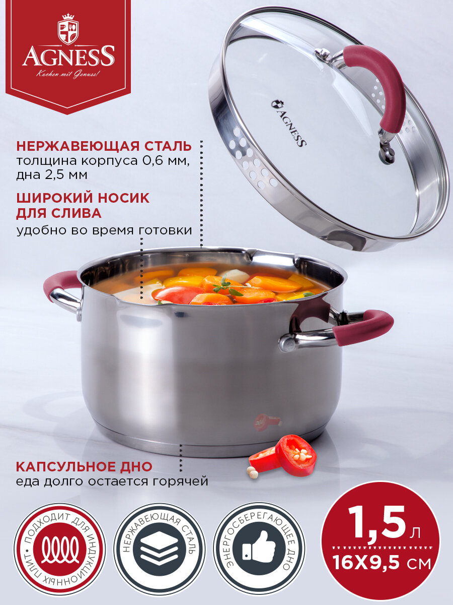 Кастрюля нержавеющая сталь для индукционных плит agness "profi home" со стеклянной крышкой, 1,5л 16x9.5 см