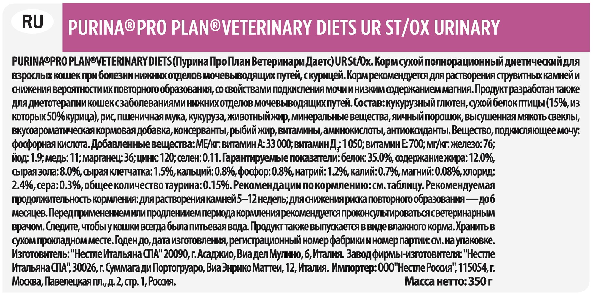 PRO PLAN VETERINARY DIETS UR ST/OX URINARY CHICKEN для взросл кошек при мочекаменной болезни с куриц 0,35 кг