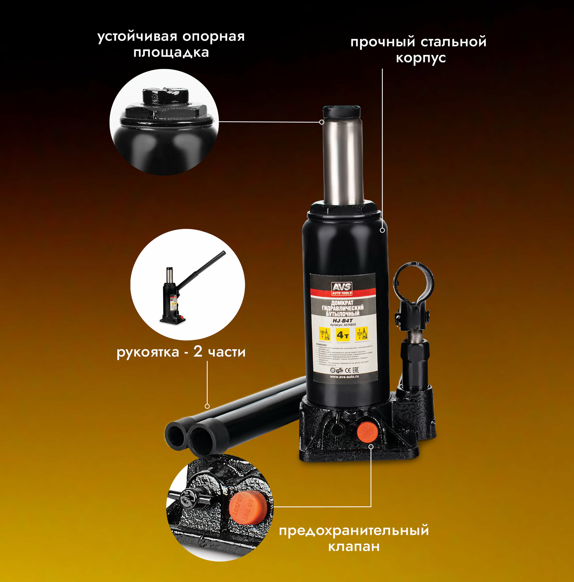 Домкрат Домкрат автомобильный (бутылочный) гидравлический AVS HJ-B4T, 4 тонны, A07085S