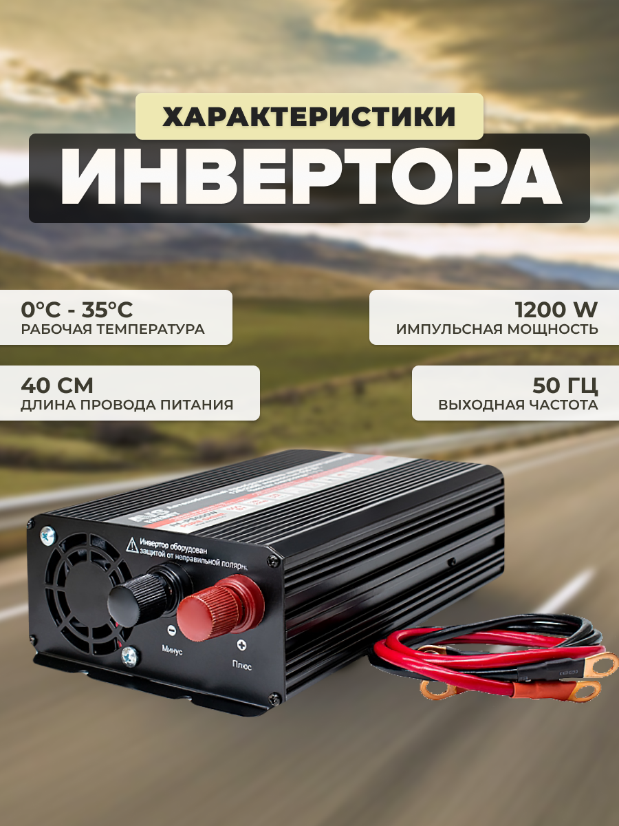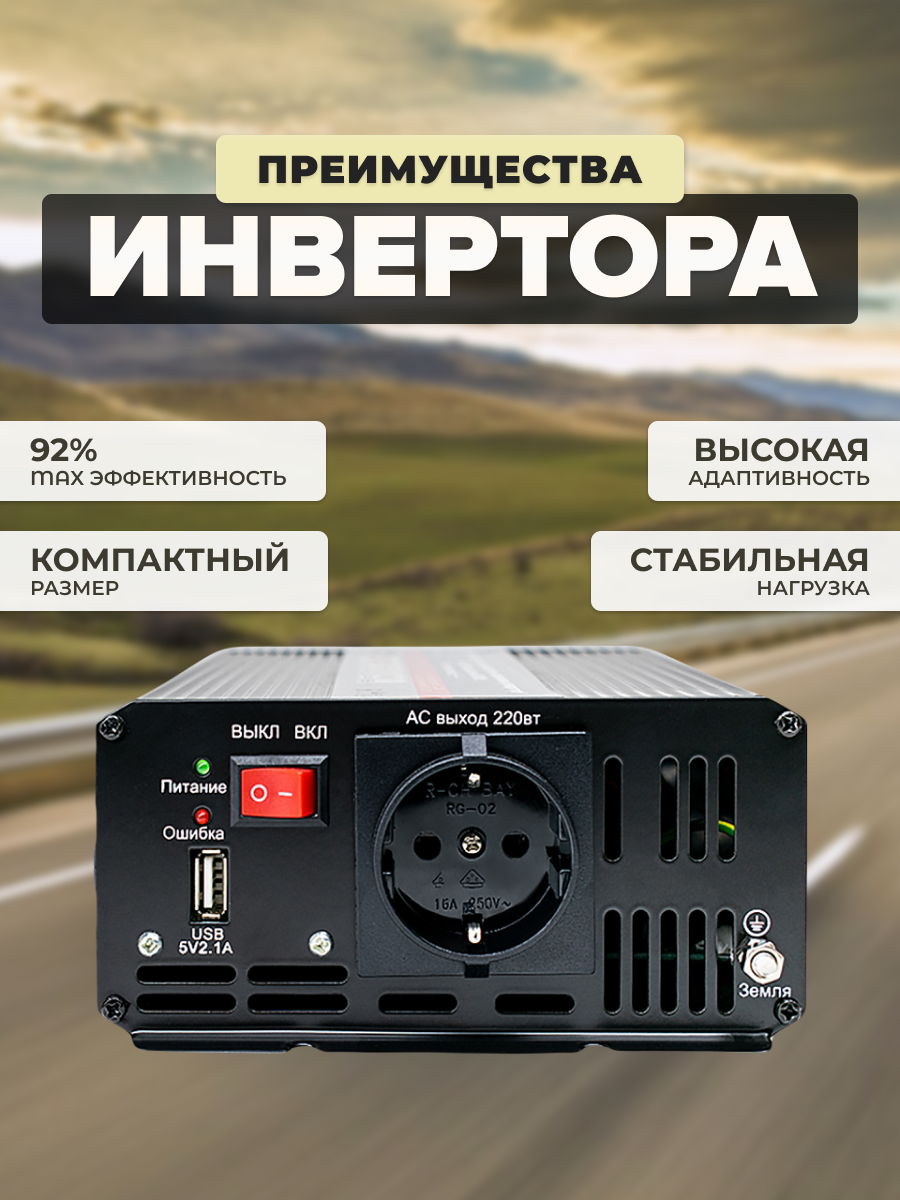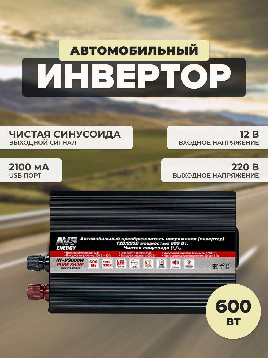 Автомобильный инвертор Преобразователь напряжения 12/220V, инвертор автомобильный AVS IN-PS600W Чистая синусоида, A07977S