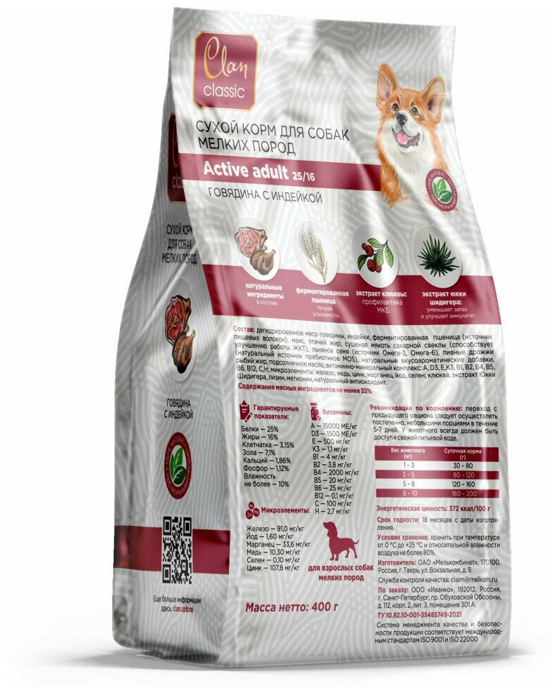 Корм Clan Classic Active 25/16 для активных собак малых пород, с говядиной и индейкой, 400 г