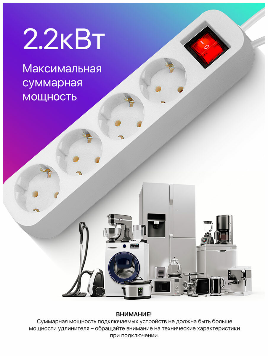 Лучшие цены. Удлинитель на 4 розетки с заземлением. Простой и надежный бытовой удлинитель, который предназначен для электроприборов и использования внутри помещений.Подходит для дома, офиса и коммерческих помещений. 10004; Предусмотрена возможность крепления на стену. 10004; Длина провода 5 метров. 10004; Мощность 2200 Вт. Максимальный допустимый ток 10А. 10004; Корпус из негорючего пластика. 10004; Индикатор сети. 10004; Выключатель питания. Магазины в вашем городе.