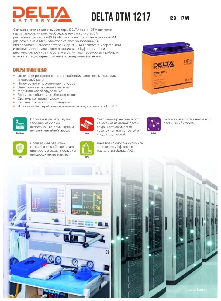 Аккумуляторная батарея для ИБП любых торговых марок, 12 В, 17 Ач, 181х77х167 мм, DELTA, DTM 1217 Комплект - 1 шт .