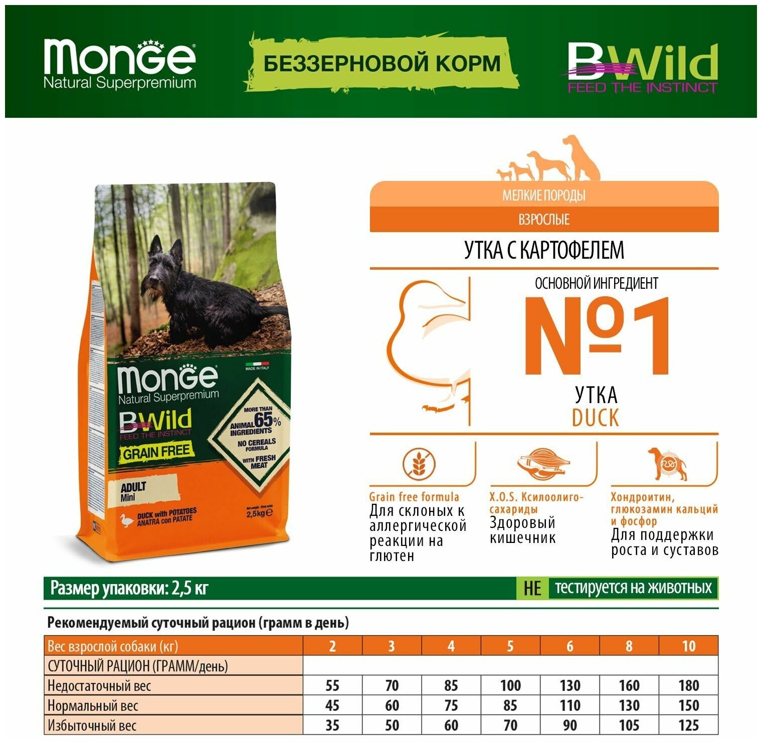 Лучшие цены. Monge (Монж) Dog BWild GRAIN FREE Mini (холистик) беззерновой сухой корм из мяса утки с картофелем для взрослых собак мелких пород 2,5 кг. Появление линии кормов BWild GRAIN FREE было обусловлено идеей создания для собак рациона питания, аналогичного тому, которое получали их неодомашненные предки, получавшие высокобелковую пищу и не употреблявшие зерновые продукты. Магазины в вашем городе.