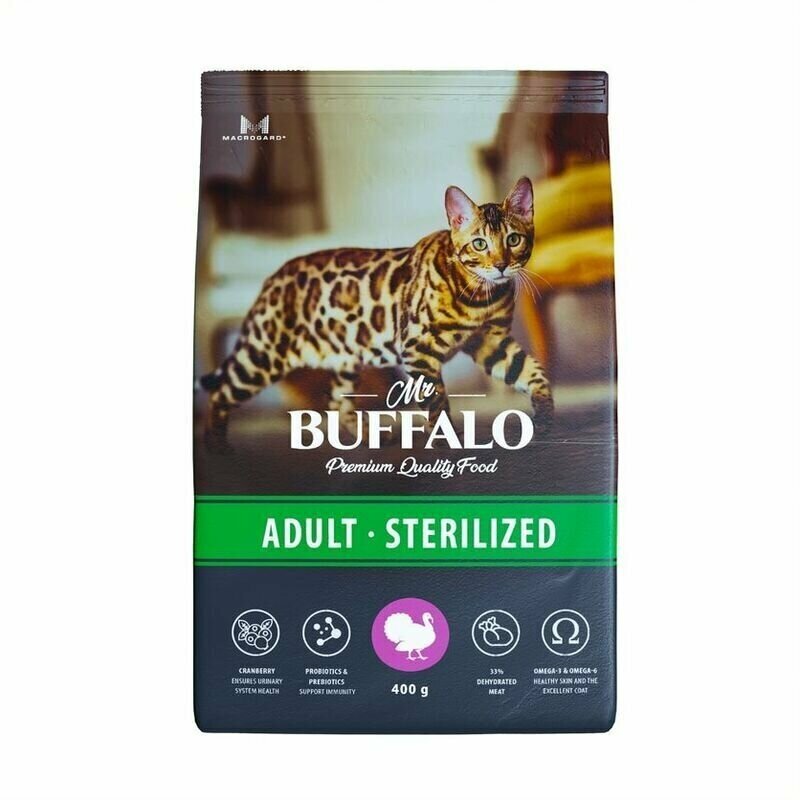 Лучшие цены. Описание Полнорационный сухой корм премиум класса для стерилизованных котов и кошек Mr.Buffalo STERILIZED с индейкой. Корм для кошек сухой Мистер Баффало разработан с учётом потребностей стерилизованных кошек и кастрированных котов, включает все необходимые питательные вещества для поддержания жизненных сил, здоровья мочевыделительной системы, поддержания оптимального веса и мышечной массы питомца. Именно на потребности стерилизованных кошек и котов рассчитан витаминно-минеральный премикс. Магазины в вашем городе.