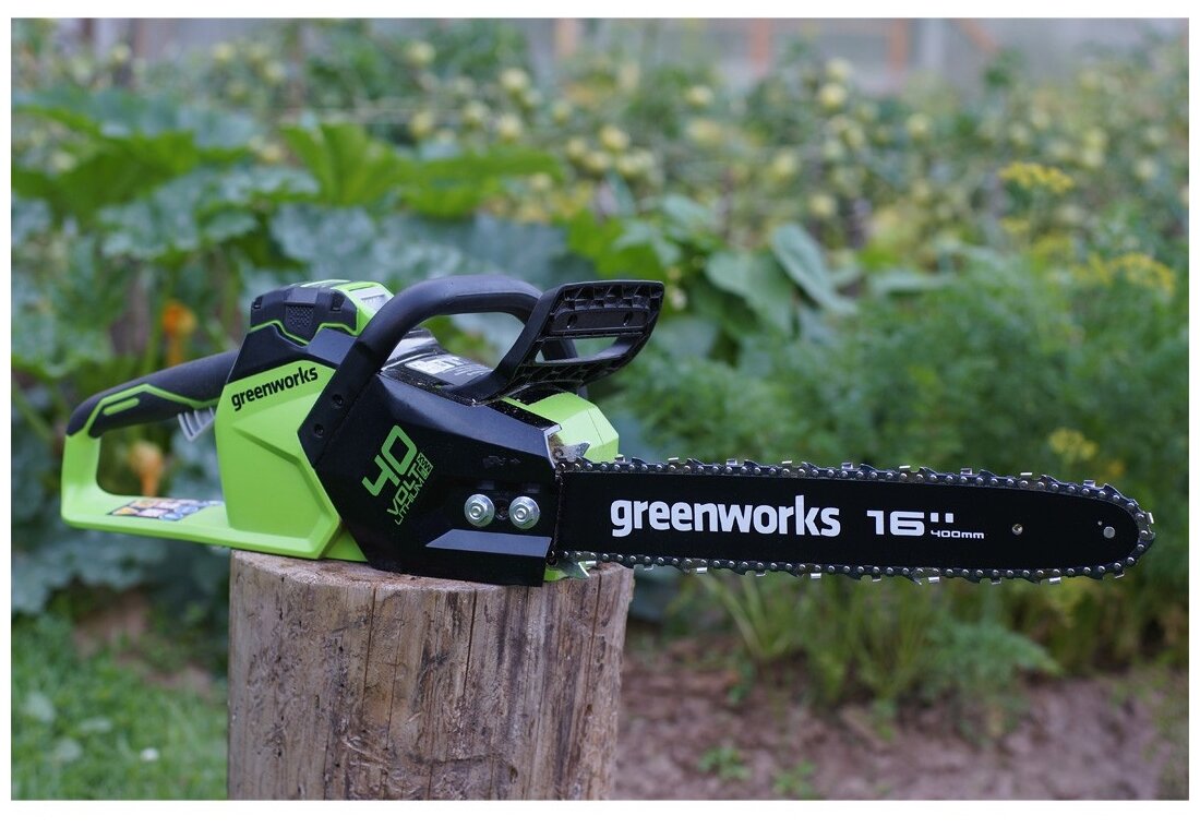 Лучшие цены. Цепная аккумуляторная пила GreenWorks 40 вольт (модель GD40CS18) - полупрофессиональная цепная пила, которая отлично подойдет для полноценного ведения дачного хозяйства. Ее надежный бесщеточный двигатель сопоставим по мощности с бензиновыми аналогами на 1,9 л/сил. При этом электродвигатель пилы GreenWorks абсолютно экологичен, имеет высокий крутящий момент (пилит быстрее бензинового аналога). Магазины в вашем городе.