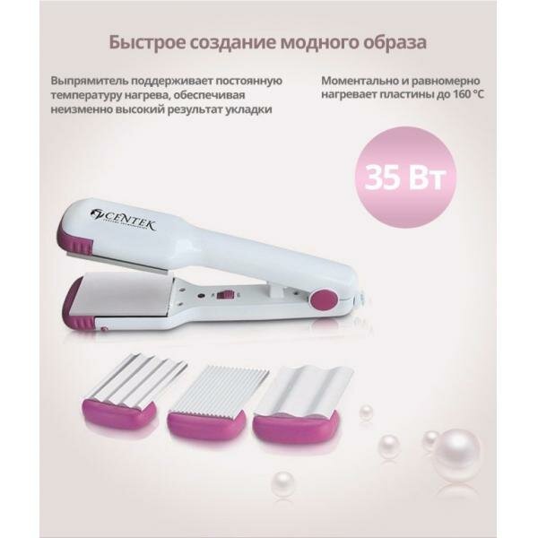Фен Выпрямитель Centek CT-2005 (бел/роз) 35Вт, гофре, 4 насадки, LED индикатор, широкие пластины