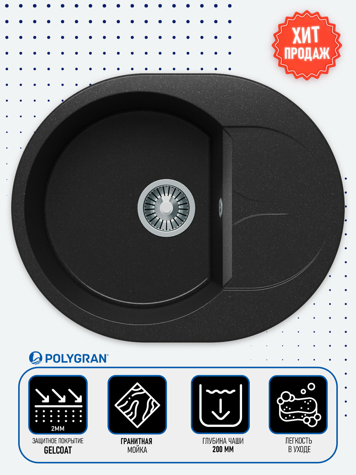 Мойка для кухни каменная POLYGRAN ATOL-620, черная, врезная, круглая, с крылом (№16 Черный) 7 200 ₽ Подробнее
