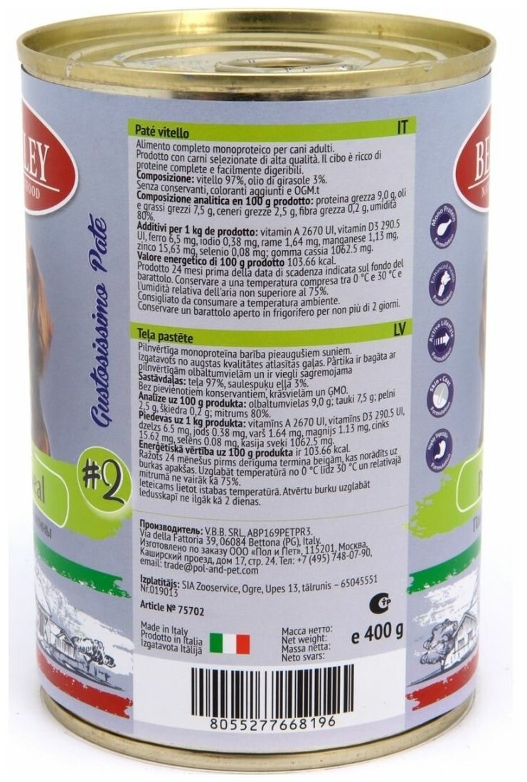 Корм для собак Беркли 75702 кон.д/собак 2 паштет из Телятины 400г