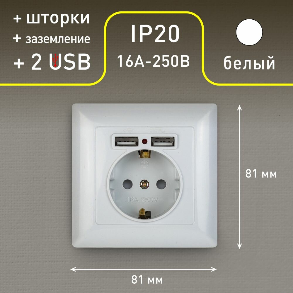 Розетка Intro 4-410-01 Intro Розетка P+E Schuko со шторками, 16А-250В + 2хUSB, СУ, Solo, белый (10/100/2500)