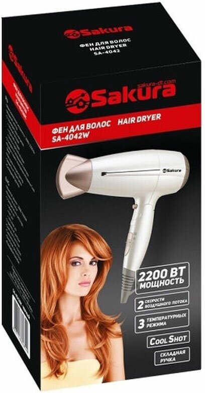 Лучшие цены. Фен для волос Sakura SA-4042W имеет мощность 2000-2200 Вт, 3 температуры нагрева (теплый воздух, горячий воздух, очень горячий воздух), 2 скорости, режим сушки холодным воздухом Cool Shot, насадка-концентратор, защита от перегрева, складная ручка. Основные характеристики: Тип: фен Тип фена: складной Мощность: 2000-2200 Вт Напряжение: 220-240 В Температурные режимы: 3 Скорости воздушного потока: 2 Ионизация: нет Сушка холодным воздухом: да Насадка: концентратор Компактное хранение: да Петля для подвешивания. Магазины в вашем городе.