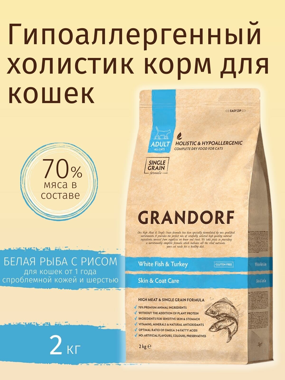 GRANDORF SINGLE GRAIN CAT ADULT SKIN & COAT CARE WHITE FISH & TURKEY низкозерновой для взрослых кошек с чувствительной кожей и шерстью с белой рыбой и индейкой (2 кг)