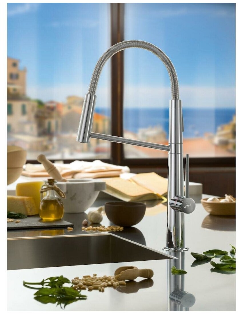 Лучшие цены. Однозахватный кухонный смеситель с высоким поворотным на 360° изливом и функцией Eco (холодный старт). От излива отходит гибкий шланг с душем. Лейка фиксируется на корпусе смесителя с противоположной от излива стороны. Цвет: хром Высота излива: 240 мм Длина излива: 222 мм Подводка: нерж. сталь, d 3/8 дюйма Излив поворотный на 360° Ограничитель напора воды на 50% Функция Eco Душ 1 режим, фиксация на магнитной подставке Аэратор с защитой от известковых отложений М 24 х 1 Смеситель позволяет снизить расход. Магазины в вашем городе.