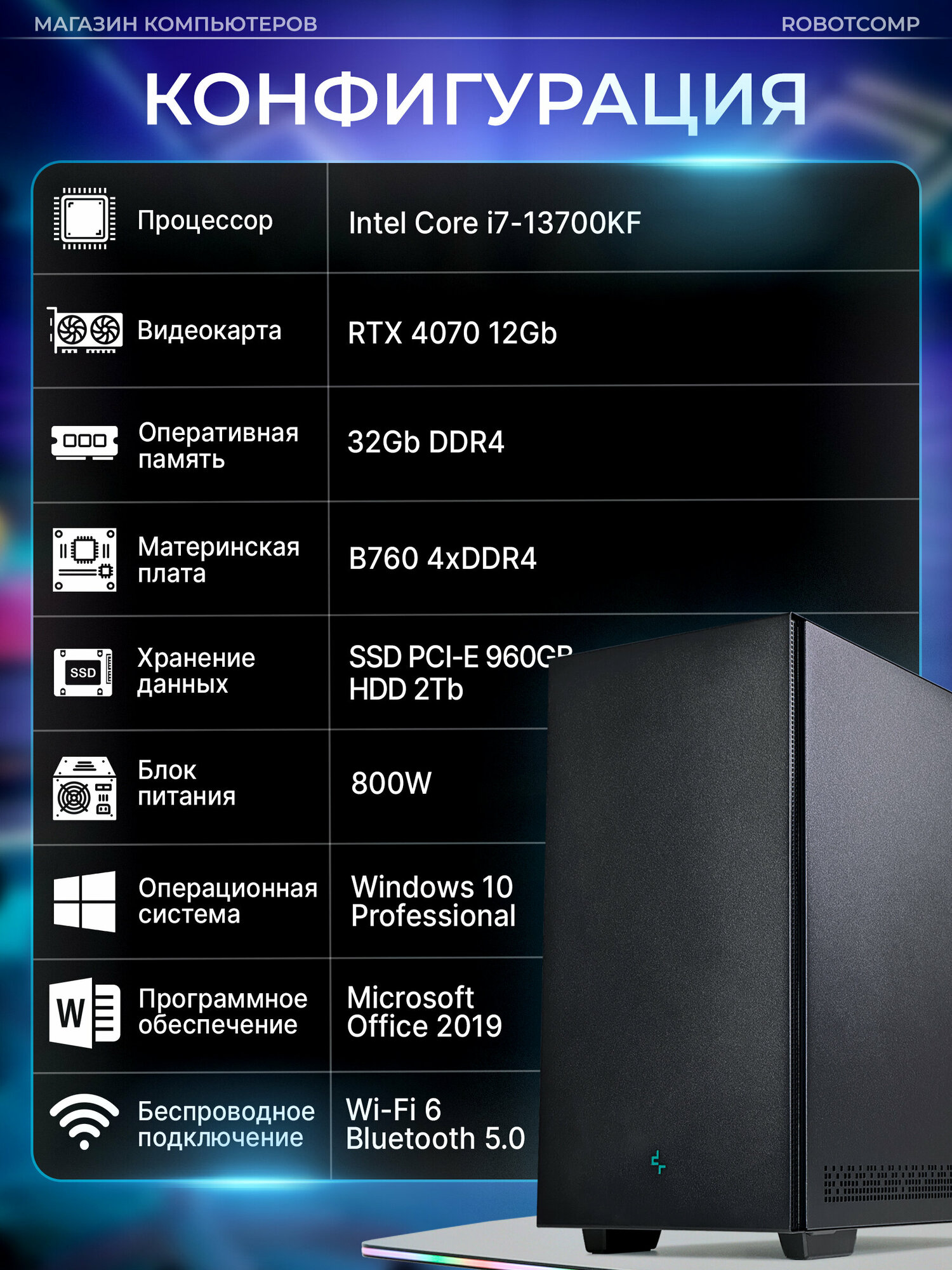 Игровой компьютер Зевс V3 Black / i7 13700KF / 32GB 3000MHZ / 2TB HDD / 960GB PCI-e / RTX 4070 12Gb / Z690 / 800W /Win10Pro/ MsOffice / WiFi / Bluetooth