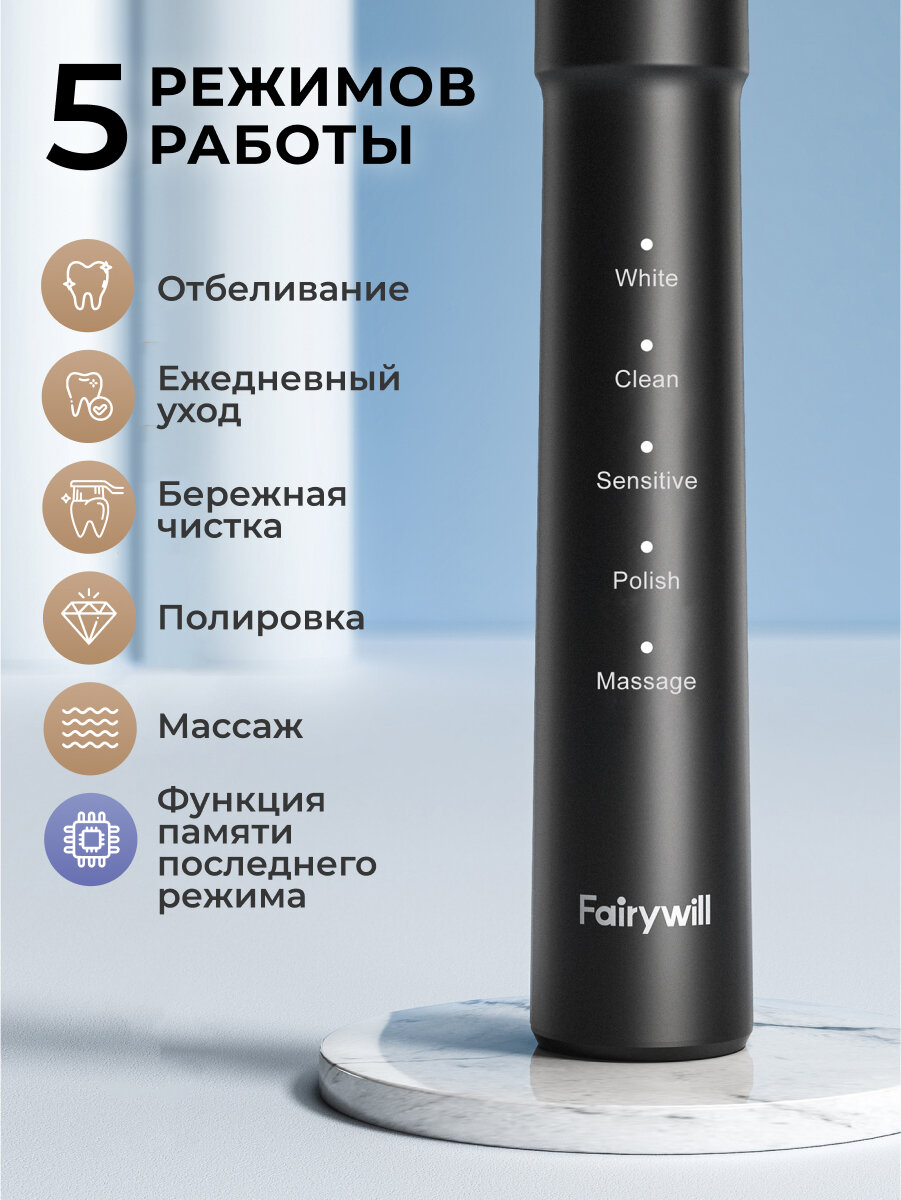 Электрическая зубная щетка Fairywill E11, 8 сменных насадок, 5 режимов для чистки полости рта,черная RC072