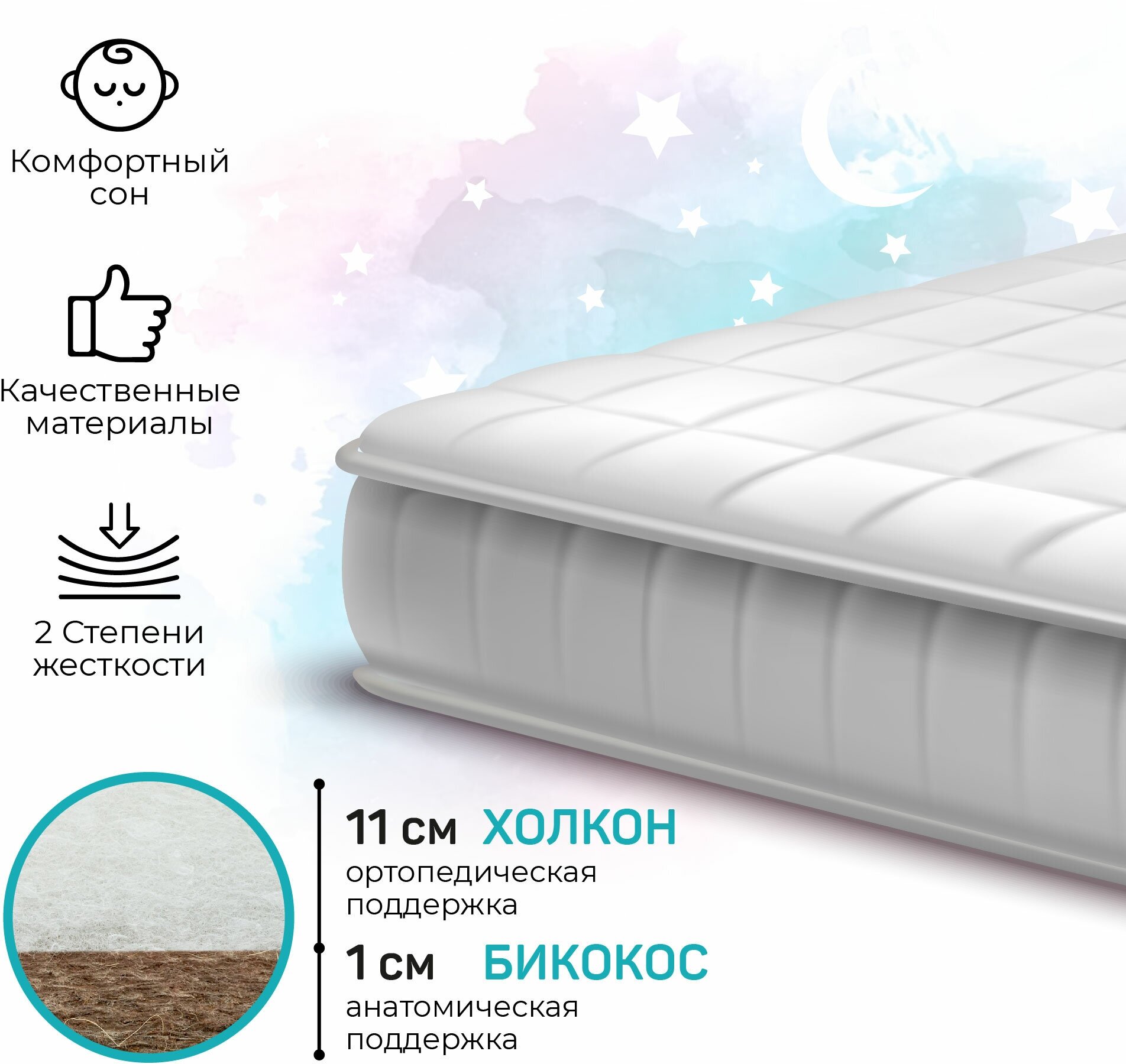 Матрас Amaro Baby со съемным чехлом, Comfort Plus 1190 x 590 х 120 (10мм - бикокос, 110 мм - холлокон, аэрофайбер, хлопок)