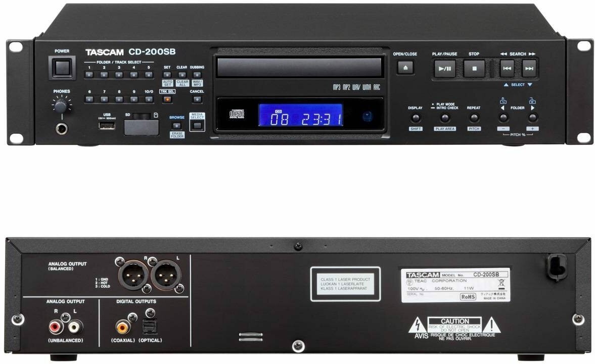 Лучшие цены. Tascam CD-200SB CD/SD/USB проигрыватель Wav, MP3, MP2, WMA, AAC , RCA/ XLR/SPDIF, CD-Text, Anti-shock, CD pitch 14%, 2U, пульт ДУ Характеристики Tascam CD-200SB: Чтение WAV, MP3, MP2, WMA, ACC. Аналоговый выход RCA и XLR. Цифровой выход SPDIF (коаксиальный и оптический). CD-Text. Anti-shock. CD pitch 12.5%. Высота: 2U. Беспроводной пульт ДУ в комплекте. Размеры: 481 x 94.5 x 298 мм Вес: 4.7 кг Профессиональный CD-проигрывательCD-200SB - это надёжное универсальное устройство для воспроизведения аудио. Магазины в вашем городе.