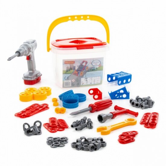 Конструктор Конструктор полесье 58096 Изобретатель - Автомобиль №1 и шуруповёрт, 91 элемент (в ведёрке)