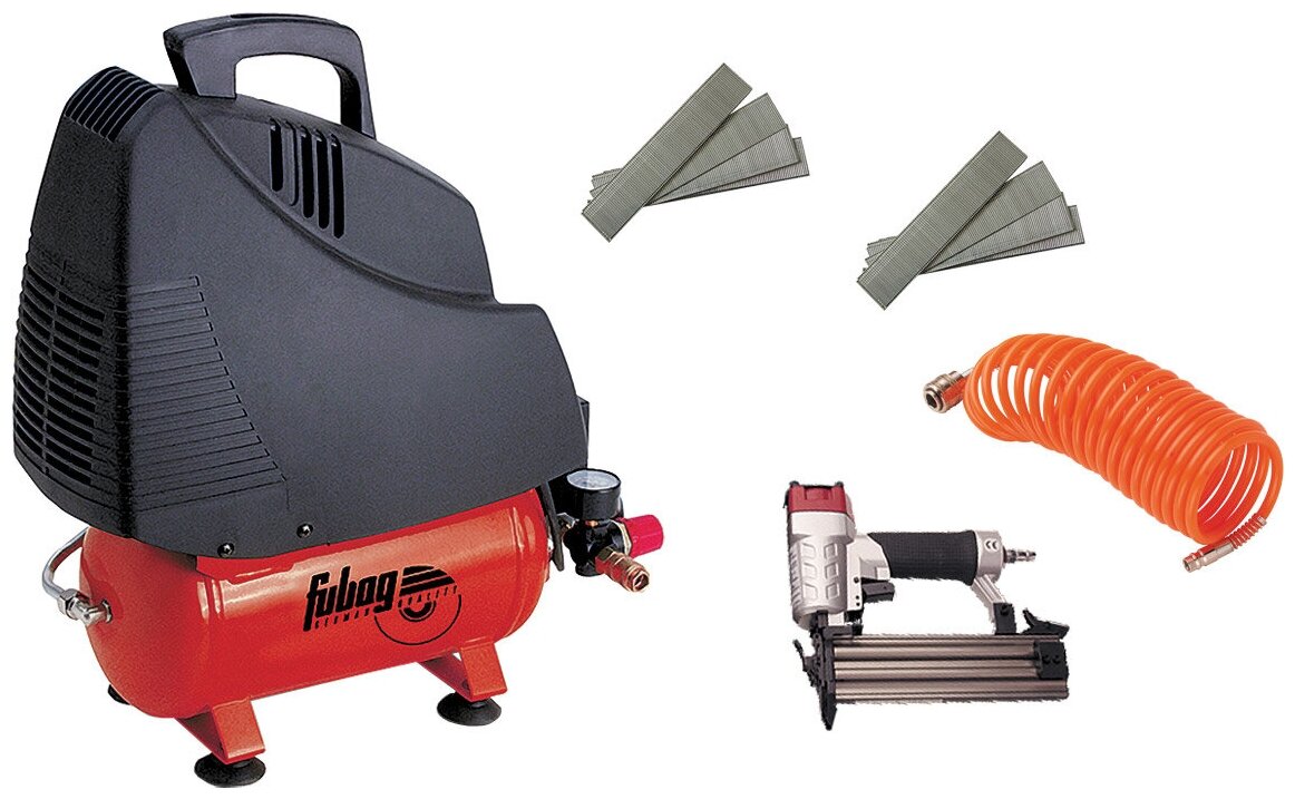 Лучшие цены. Набор пневмоинструмента WOOD MASTER KIT на базе компрессора FUBAG OL 195/6. Предназначен для проведения крепежных и других работ по дереву, а также работ, по изготовлению и ремонту мебели и деревянных строений. В комплект с компрессором входит: • Гвоздезабивной пистолет для гвоздей 50 мм • Два набора гвоздей по 1000 шт каждый • Гибкий спиральный шланг (10 м). Магазины в вашем городе.