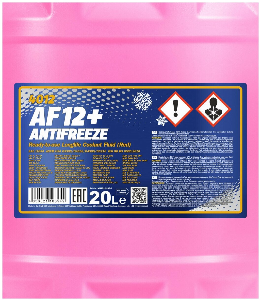 4012 MANNOL ANTIFREEZE LONGLIFE AF12+ 20 л. Готовый раствор охлаждающей жидкости антифриз красный