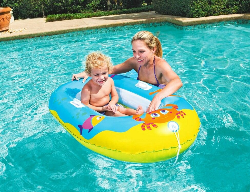 Лучшие цены. Надувная лодочка для детишек от 3 до 6 лет. Привлекательная расцветка с рисунками морских обитателей. Пластиковые ручки по обеим сторонам. Мягкое дно. Магазины в вашем городе.