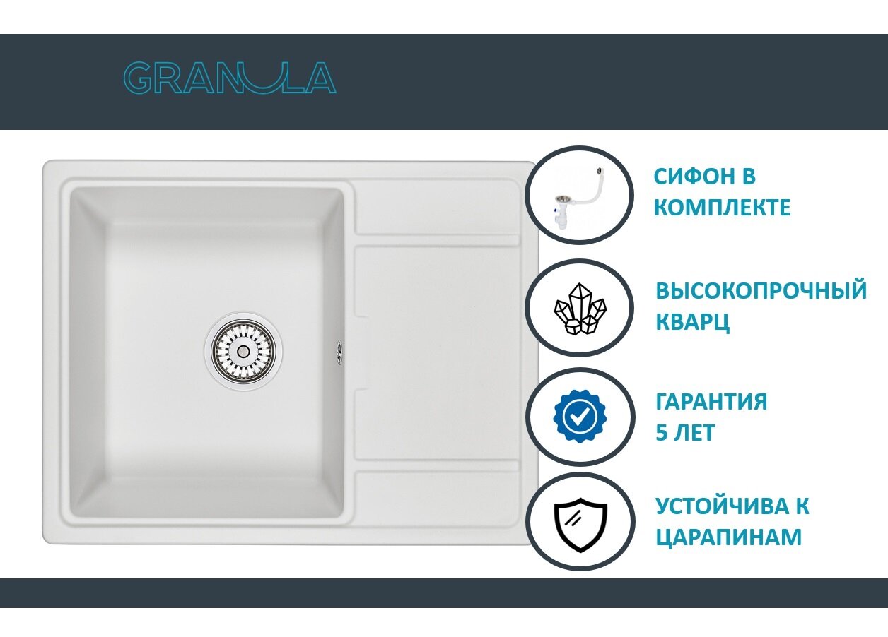 Лучшие цены. Кухонная мойка Granula Gr-6503 арктик Размер основной чаши: 380х430х200 мм Ширина шкафа под мойкой: 45 см Отверстие перелива расположено в чаше мойки В комплект входит сливная арматура 3 1/2 (90 мм) с переливом и сифоном Кварцевые мойки Granula, произведённые из композитного материала, имеют приятную на ощупь структуру, которая схожа с поверхностью натурального камня. Они созданы для тех, кто ценит естественную красоту и функциональность. Магазины в вашем городе.