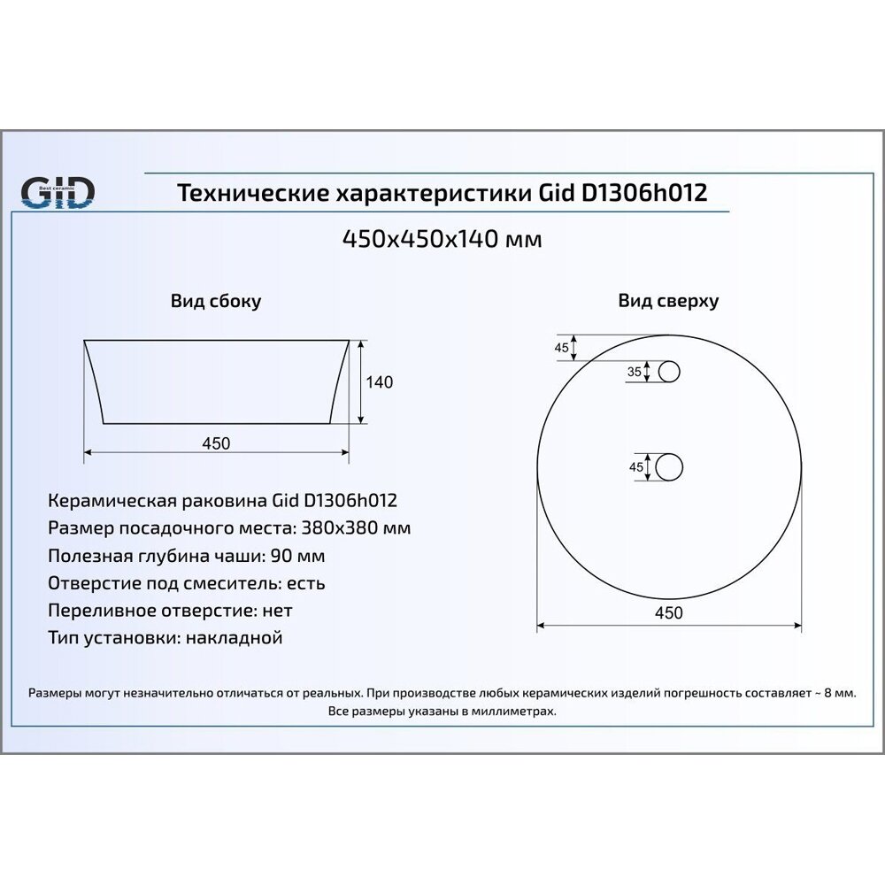 GID Раковина накладная Gid D1306h012 7 450 ₽ Подробнее